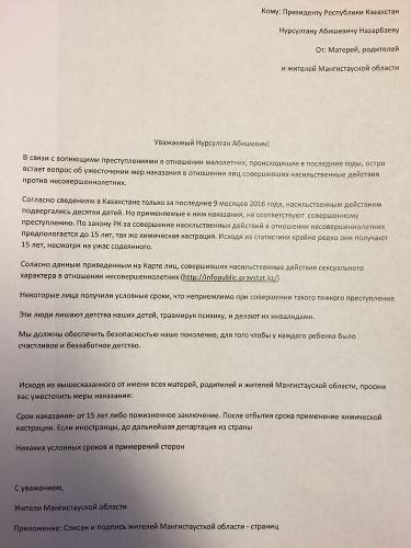 Ақтаулықтар 6 жасар қызды зорлаған адамның жазасын қатаңдатуды сұрап, ҚР Президенті Нұрсұлтан Назарбаевқа жолданатын хатқа қол жинап жатыр, - деп хабарлайды Qamshy.kz Tengrinews.kz - ке сілтеме жасап.