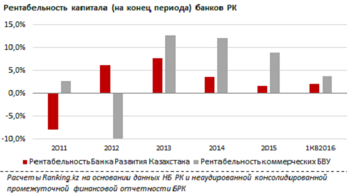 В целом финансовая система демонстрирует разнонаправленное движение более долгосрочных показателей рентабельности. И если коммерческие банки следуют строгому тренду на ее постепенное сокращение, то Банк развития Казахстана, основной источник кредитования национальных проектов, по итогам первого квартала 2016 года сумел превысить рентабельность по итогам всего 2015 года, достигнув уровня 2,1%, что лишь на 0,9 п. п. ниже установленной стратегической цели 2016 года.