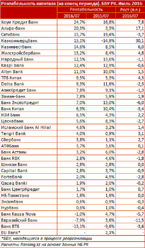 Со значительным отрывом среди всех БВУ за 7 месяцев 2016 по значению рентабельности капитала лидирует Хоум Кредит Банк (вместе с Альфа банком это единственные БВУ с рентабельностью выше 20%). В топ-3 самых рентабельных банков вошел еще один банк с иностранным капиталом - Ситибанк. Первый из банков с казахстанским капиталом - Казкоммерцбанк расположился на четвертом месте, при этом показав наибольший рост рентабельности (в связи с восстановлением после убытков от приобретения БТА Банка в 2015).