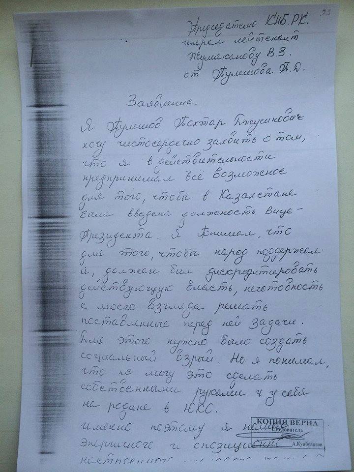 «Я, Тулешов Тохтар Джусипович, хочу чистосердечно заявить о том, что я в действительности предпринимал все возможное, чтобы в Казахстане была введена должность ВИЦЕ — ПРЕЗИДЕНТА. Я понимал, чтобы народ поддержал (меня – прим. NT), я должен был дискредитировать действующую власть, неготовность, с моего взгляда, решать поставленные перед ней задачи. Для этого нужно было создать социальный взрыв. Но я понимал, что не могу это сделать собственными руками. Именно поэтому я нашел энергичного и способного … из Атырау Талгата Аянова, который, по моему мнению, был способен увлечь за собой народ. Поэтому я решил проспонсировать его и поручить ему создать образ «борца за народ».