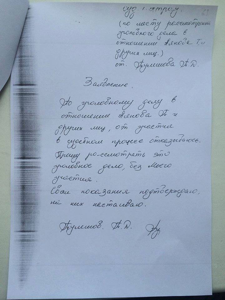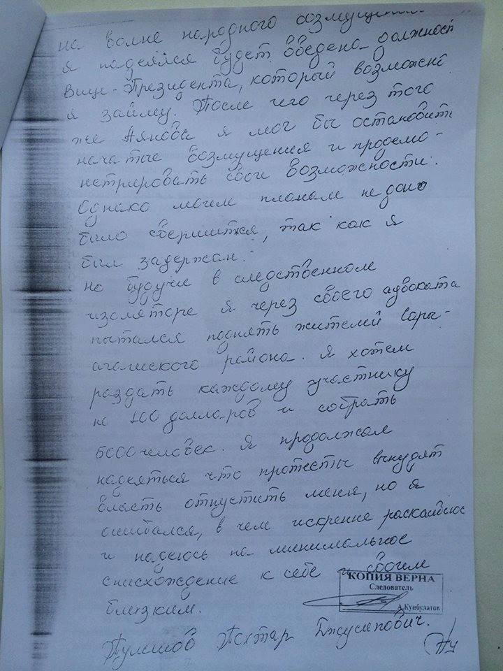 «Мен өз қоластымда жұмыс істейтін Аяновқа 100 000 доллар беріп, қазақ жерінің шетелдіктерге сатылатыны туралы жалған ақпаратты жұртқа таратуға тапсырдым. Мен мұның халық наразылығын тудыратынын, халық жерін қорғау үшін алаңға шығатынын білдім», — делінген Тоқтар Төлешовтің өз қолымен жазған хатында.