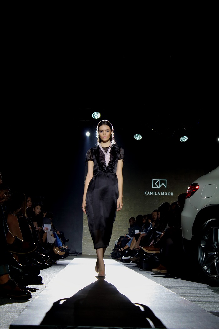 Начинающий дизайнер бренда Камилы Мур придерживается геометрических форм и пастельных тонов. Силуэты были небрежно нежными в светло розовых и лиловых тонах. Камила Мур скомбинировала вязаные свитера, кардиганы с шелковыми платьями.