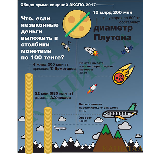 Если 10 млрд 200 млн тенге выложить в длину купюрами по 500 тенге, то получится дорожка расстоянием 2733,6 км. Это больше, чем диаметр Плутона: 2374 км. 4 млрд 200 млн в виде столбца монет по 100 тенге имеет высоту в 81.9 км, а 680 млн — 13.2 км (толщина монеты 100 тенге равна 0.195 м).
