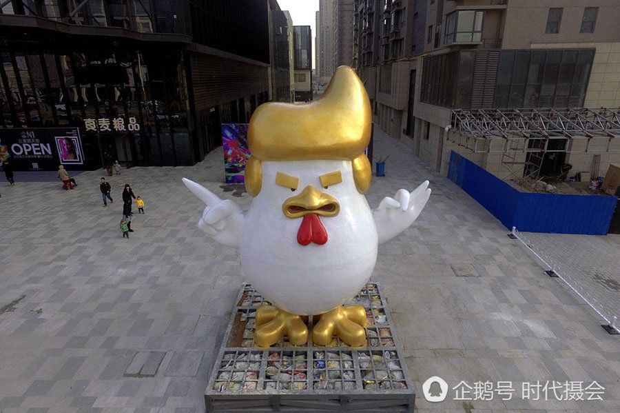 Қытайтың Таюнь қаласының орталығында Шанси аймағында АҚШ-тың президенті Дональд Трамптын айнымайтын алтын айдарлы, қабағын шытып тұрған тауық мүсінін жасаған деп хабарлайды lenta.ru, мәліметтің қазақша нұсқасын «Қамшы» порталы оқырман назарына ұсынады.