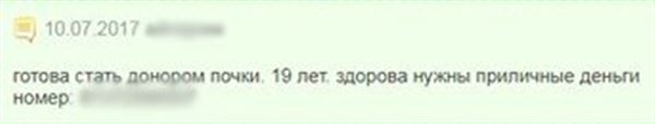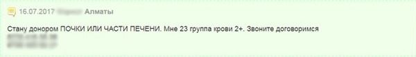 "Маған өте қомақты қаржы керек, сол себепті де өзімнің бүйрегімді форумға жарнамалап, сатылымға қойдым. Ол жердегі адамдар бұл мәселеге шынайы мән бермейтін секілді. Мен бағасын айтқаным жоқ, егер де маған жақсы ұсыныс түсіп, көп қаржы ұсынатындар болса, мен бүйрегімді сатуға дайынмын.