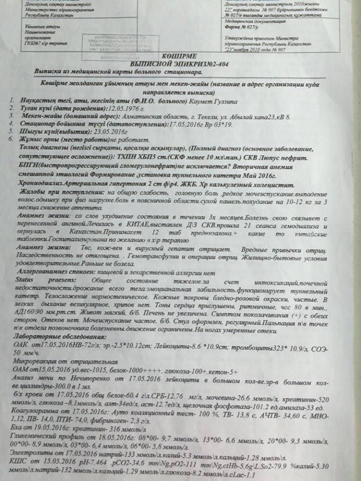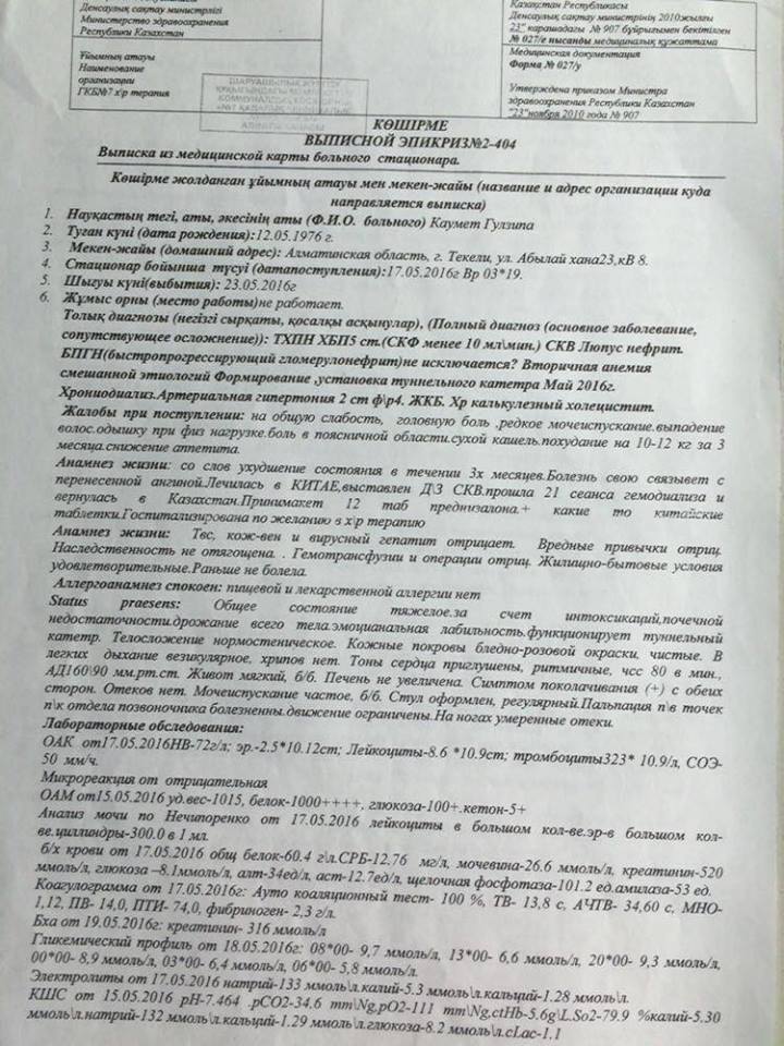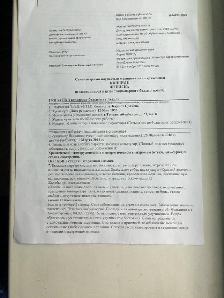 الماتى قالاسىنداعى 7-اۋرۋحانادا اقىلى بولىمدە ەم قابىلداعان سوڭ، دارىگەرلەردىڭ ۇيعارىمىمەن تەكەلى قالاسىنىڭ اۋرۋحاناسىنا جونەلتىلگەن. ءقازىر تەكەلىدە تۇراقتى تۇردە (ەكى كۇندە ءبىر رەت) قان سۇزگىزىپ جاتقان جايى بار. دارىگەرلەردىڭ قويعان دياگنوزى: ءورشۋ ساتىسىنداعى نەفروتيكالىق سيندرومدى سوزىلمالى گلومەرۋلونەفريت (ىسىنۋلەر، انا-ساركا). سوزىلمالى بۇيرەك جەتىسپەۋشىلىگى، 2-ساتى. ەكىنشىلىك انەميا. سوزىلمالى بۇيرەك اۋرۋى، 2-ساتى. تەز ءورشۋشى گلومەرۋلونەفريت، ەكىنشىلىك انەميانىڭ ارالاس ەتيولوگياسى.