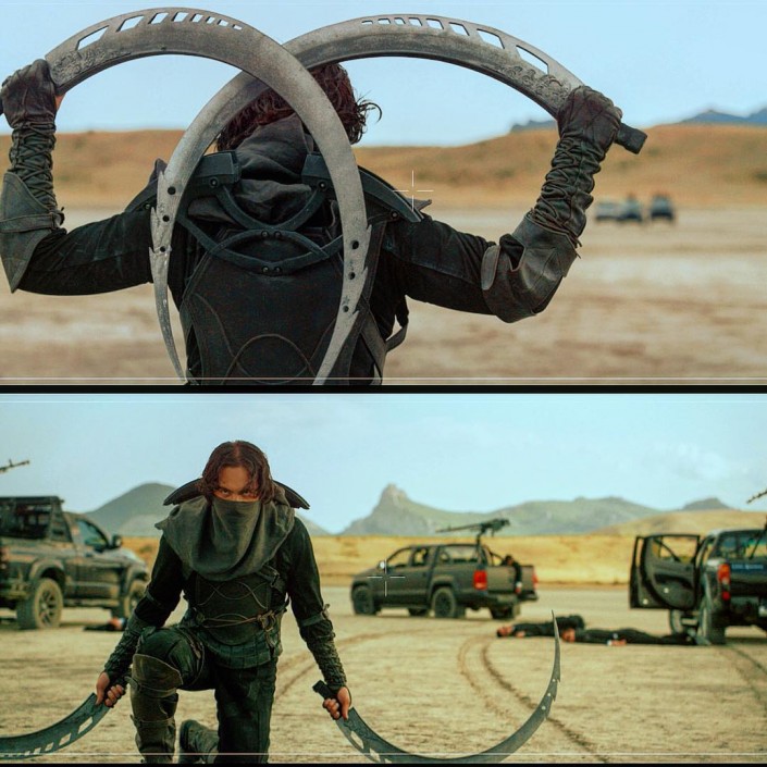 "قورعاۋشىلار" فيلمىندە شىعىستىق ۋشۋ جانە كۋنگفۋىنا ۇقساس ەلەمەنتتەر بولدى. باتىردىڭ كيىمىمەن مەن جۇگىرىپ، سەكىرە المادىم. (...) مەن ويناعان باتىر - بۇرىنعى كيللەر، ول ءوز قىلىشى ارقىلىوتە شاپشاڭ توبەلەسەدى"، - دەدى اكتەر.