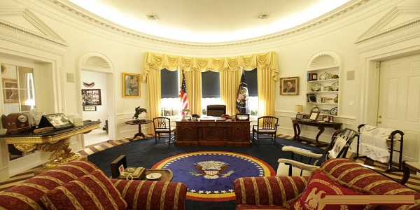 اقش پرەزيدەنتىنىڭ جۇمىس بولمەسى وزگەلەرمەن سالىستىرعاندا ۇلكەنىرەك. ءتىپتى، ول تەلەارنالارعا مالىمدەمە جاساعاندا دا اۋقىمدىراق جەردى تاڭدايتىنىن بىلەمىز. امەريكا قۇراما شتاتتارىنىڭ پرەزيدەنتىنىڭ جۇمىسى ۇلكەن جۇمىس بولمەسىندە 3 ۇلكەن تەرەزە جانە 4 ەسىك بار. پرەزيدەنتتىڭ جۇمىس بولمەسى – وڭتۇستىك تەرەزە جاعىندا ورنالاسقان. ال سولتۇستىك جاعىندا پەش قويىلعان.