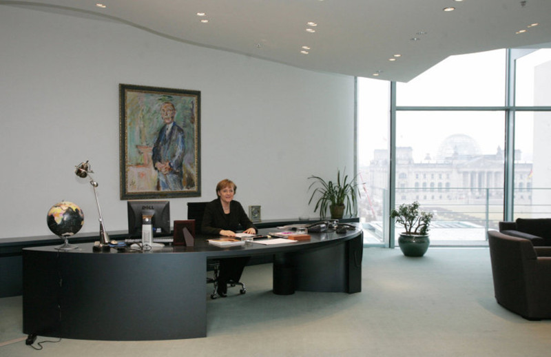 گەرمانيا كانسلەرى اندجەلا مەركەل حانىمنىڭ جۇمىس بولمەسى وتە قاراپايىم عانا. اسا قىمبات ەمەس جۇمىس ۇستەلىندە بىرنەشە تەلەفون، ۇلكەن ەكران، شىراق جانە گلوبۋس ورنالاسقان.